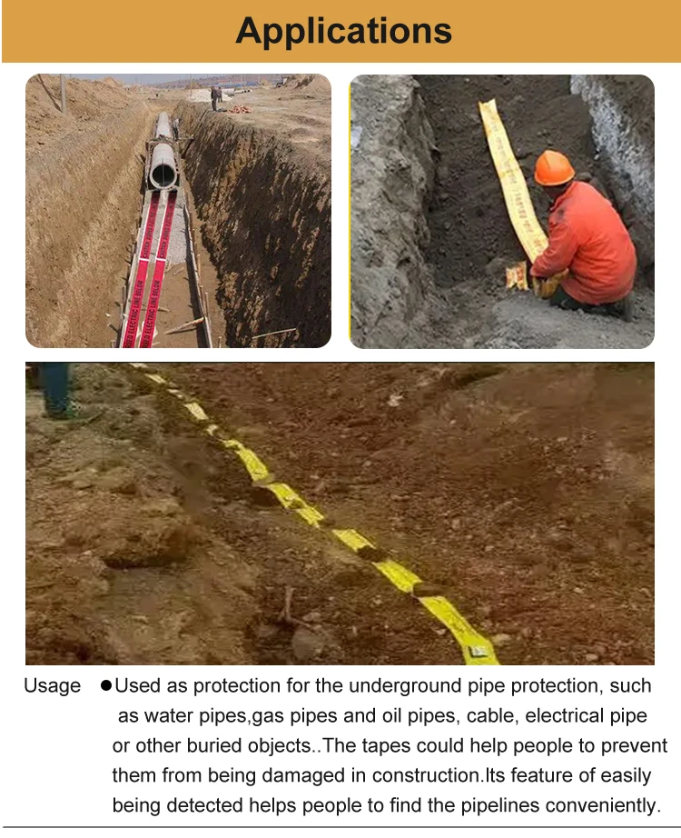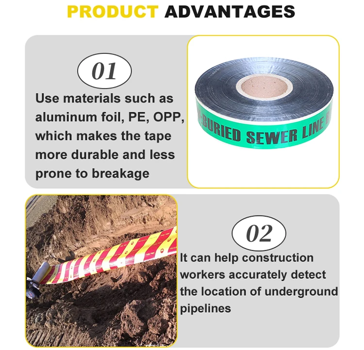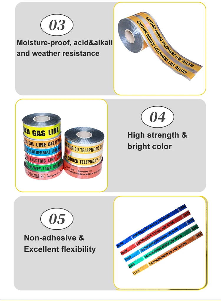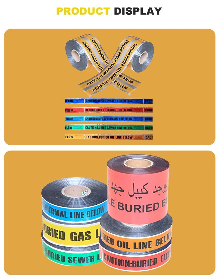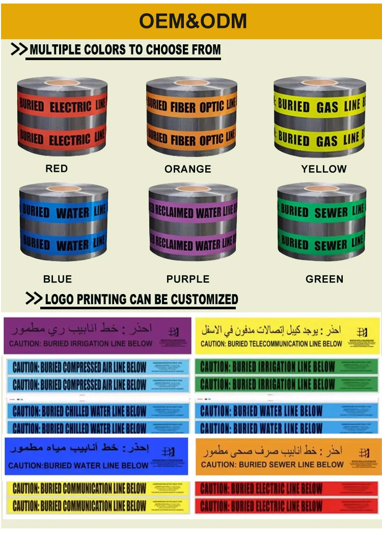 Underground Metal Foil Detectable Warning Tape Aluminum Tape Optical Fiber Cable Detectable Tape 1- 100 pieces101 - 499 pieces500 - 1000 pieces $1.95 $1.65 $1.35 Phone:+86 15058222082 E-mail: jack@aiyatape.com WhatsAPP: +86 15870766082 Download product catalog Brand: AIYA TAPE Item NO:AIYA-5474 OEM service: Offer Sample: Freely Provided Delivery time:7 Days On-time delivery:100.0% Underground Metal Foil Detectable Warning Tape: Aluminum-based, ideal for marking optical fiber cables. Highly detectable, durable—prevents damage in construction. Reliable underground safety solution. Product Details TEL:+86 15058222082 WhatsApp:+86 15870766082 EMAIL:jack@aiyatape.com Place of OriginXiamen, ChinaMaterialPE+Aluminum foil+OPPGlueNon adhesiveLength100-500mWidth50mm,70mm,75mm,100mm,150mThickness100-150micronColorBlue/Purple/Green/Red/Orange/YellowMOQ100rollsPrintingCustomised to customer requiremmentUseUnderqround Cable MarkingProduct DescriptionApplication Prev: High Quality Non-Detectable Marking Warning Tape for Underground Utility Cable Buried Wire Trace Marker Next: Standard Caution Electric Warning Tape with Traceable Wire Detectable Below Electrical Cable Underground Warning Mesh Machine Related Products Underground Electric Cable protection Cover Warning Board Cable Tile Underground Detectable Tape 3inchx 1000 Feet Printed Black and Red Are Electrical Line Detective Underground Warning Tape Detectable Underground Warning Tape Caution Buried Communication Line Below Underground Warning Tape Underground Electric Warning Marker Tape 150mm X 365M Underground Electrical Warning Tape
