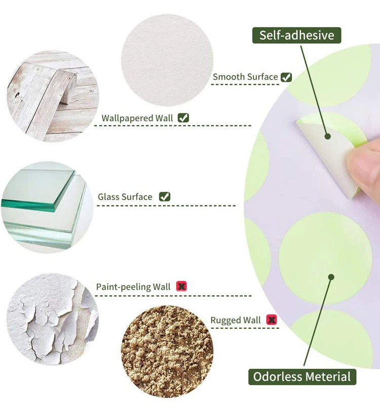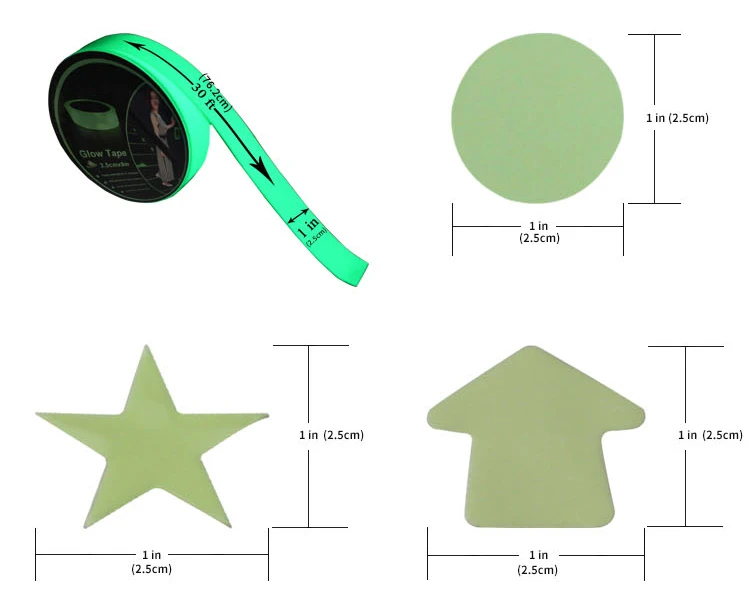 Product Description 1) Material: PVC/PET/PP/EVA material / glow in the dark material 2) Size / shape: 3cm ,3.8cm , 4.6cm ,4.2cm, 8.5cm, 10.5cm or Different Size and Shape can be customized. 3) OEM : Available 4) Sampling time: 3-5days after getting artwork 5) Sampling charge: As per the artwork . 6) Pack: With oppbag or head card/ AS Request Photoluminescent sticker, luminous decal sticker, glow in dark stickers, kid room decoration stickers. We are a manufacturer of adhesive tape. Glow stickers tape is one of our main products. The main materials are PVC/PET/P/EVA and so on. Our shapes are stars, arrows, circles, moons, earth, dinosaurs and so on. They are suitable for all kinds of decorations.