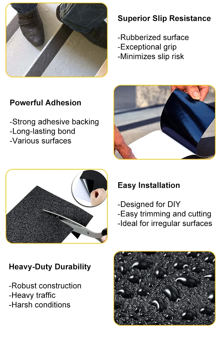 Superior Slip Resistance: Boasting a rubberized surface, our product provides exceptional grip and minimizes the risk of slips in wet or slippery environments such as bathrooms, kitchens, stairs, gym floors, and work areas.